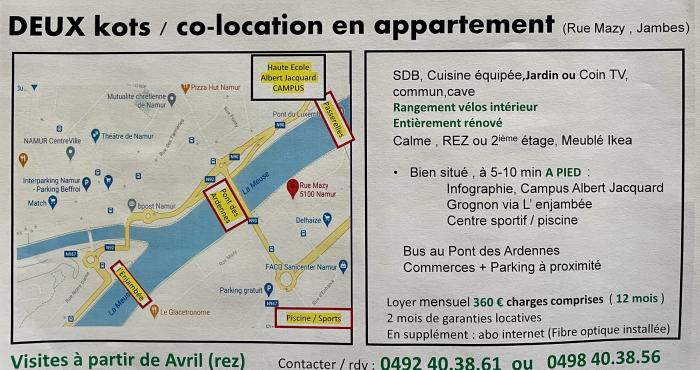2 kots (1 à l’avant, l’autre à l’arrière) dans un appartement au rez,