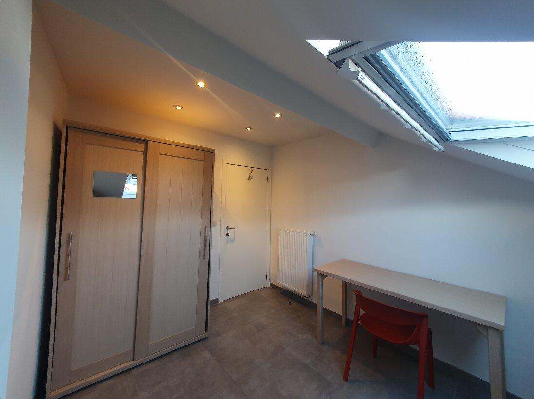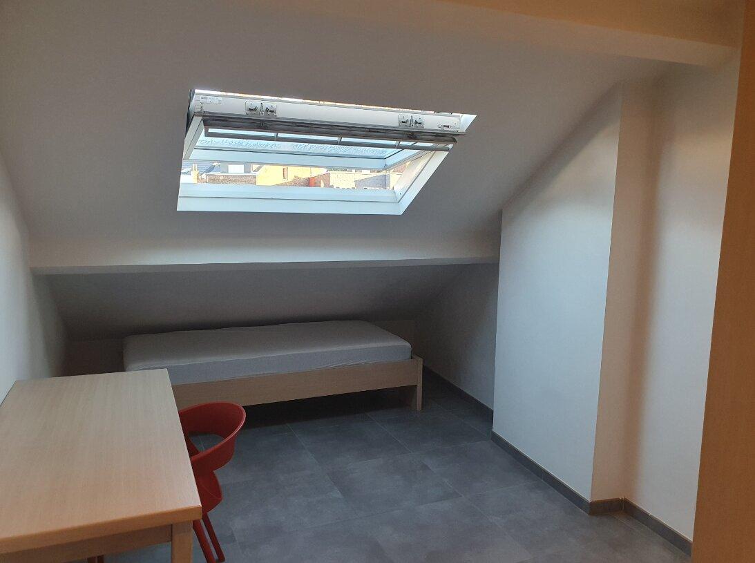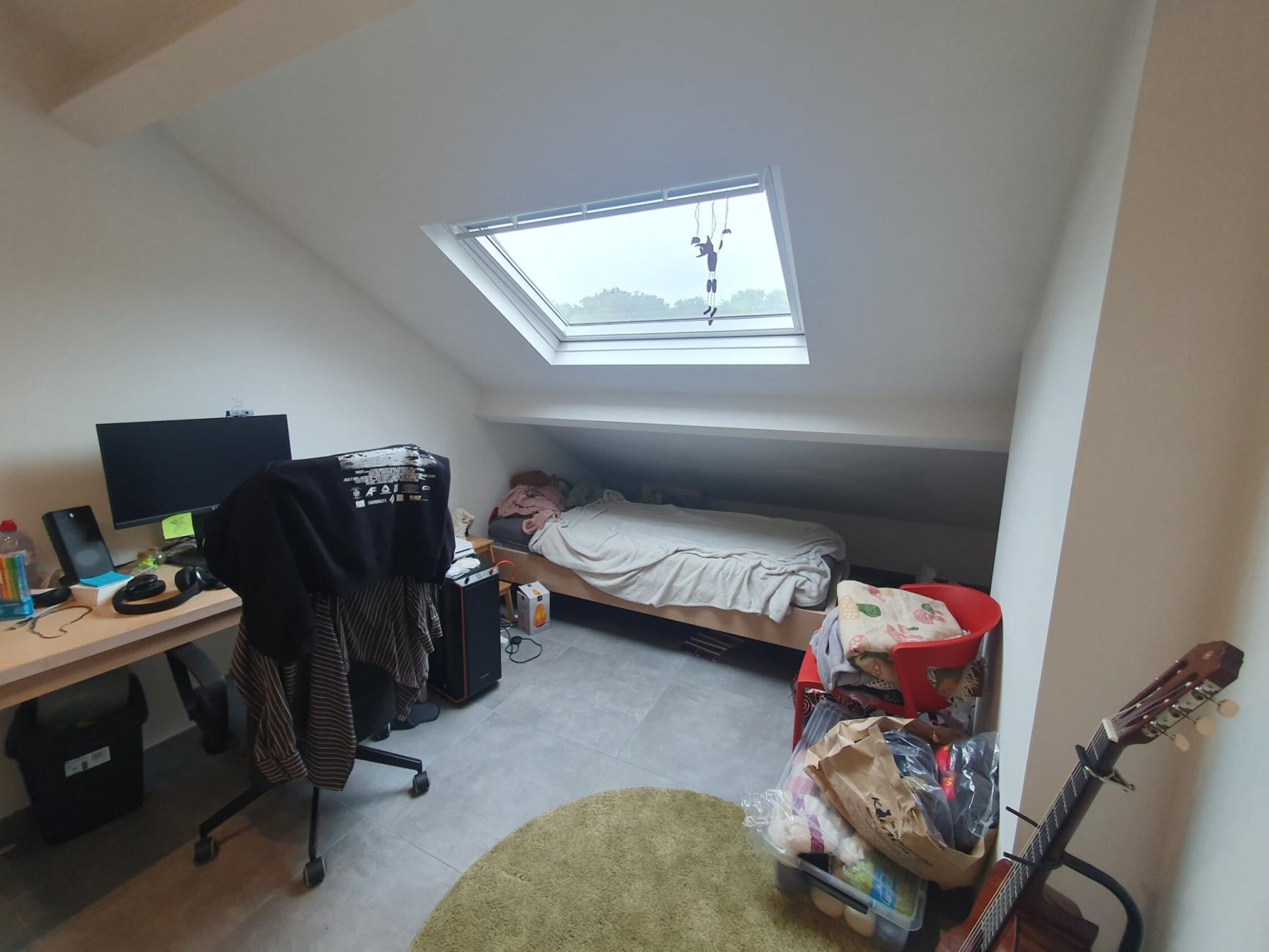 Chambre au troisième étage dans un kot comprenant 4 chambres, une salle de bains, une cuisine et des toilettes communes.