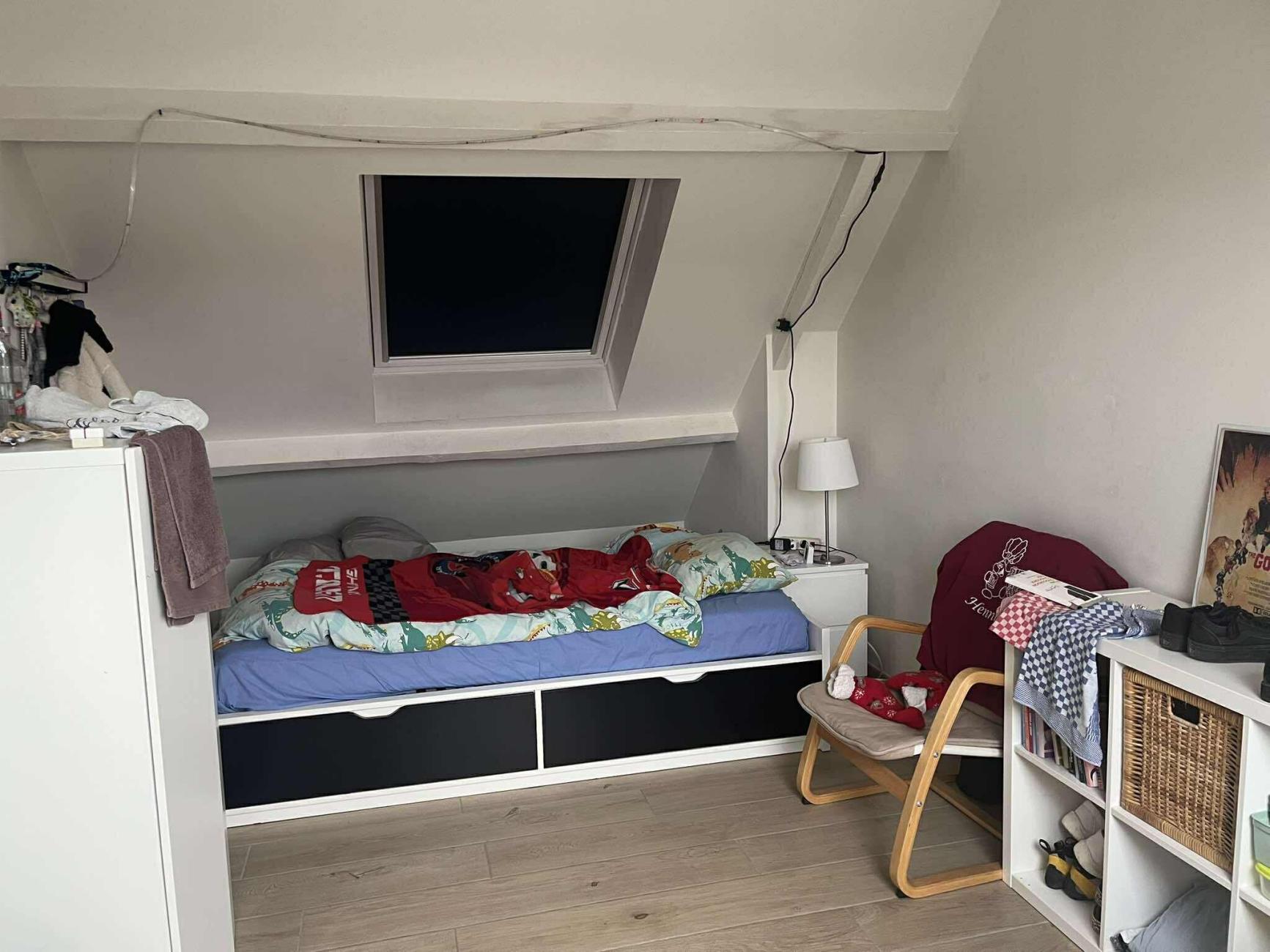 Chambre avec un lit, un bureau, un meuble de rangement, une garde-robe. Matelas fournis avec le lit.