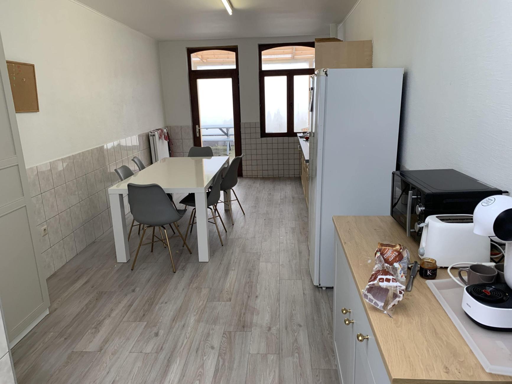 ✅ La cuisine commune est équipée : évier, grand frigo, 2 congélateurs, 1 micro-onde, 1 grilles pains, 4 taques, 1 four, 2 armoires et des espaces de rangements, grande table de cuisine avec chaises.