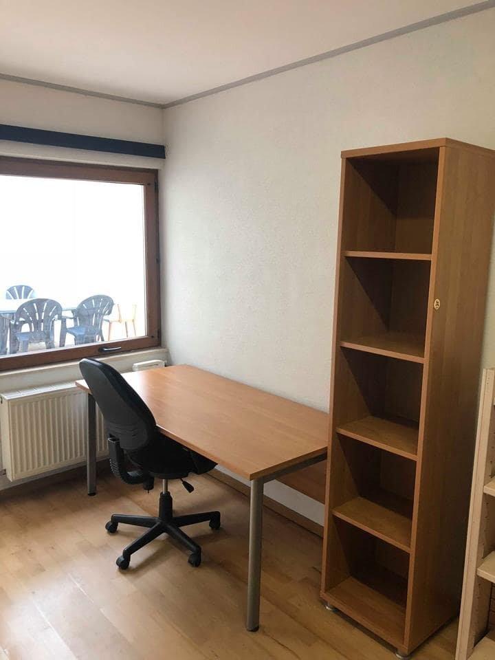 🛋️ Meublé : Lit double 140x200 et sommier (sans matelas) sans matelas, garde-robe, bureau, chaise, tentures.