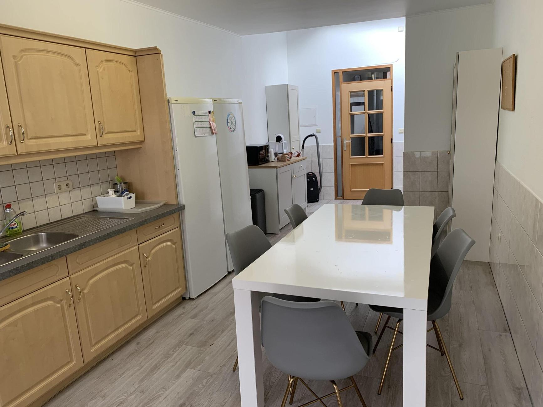 ✅ La cuisine commune est équipée : évier, grand frigo, 2 congélateurs, 1 micro-onde, 1 grilles pains, 4 taques, 1 four, 2 armoires et des espaces de rangements, grande table de cuisine avec chaises.