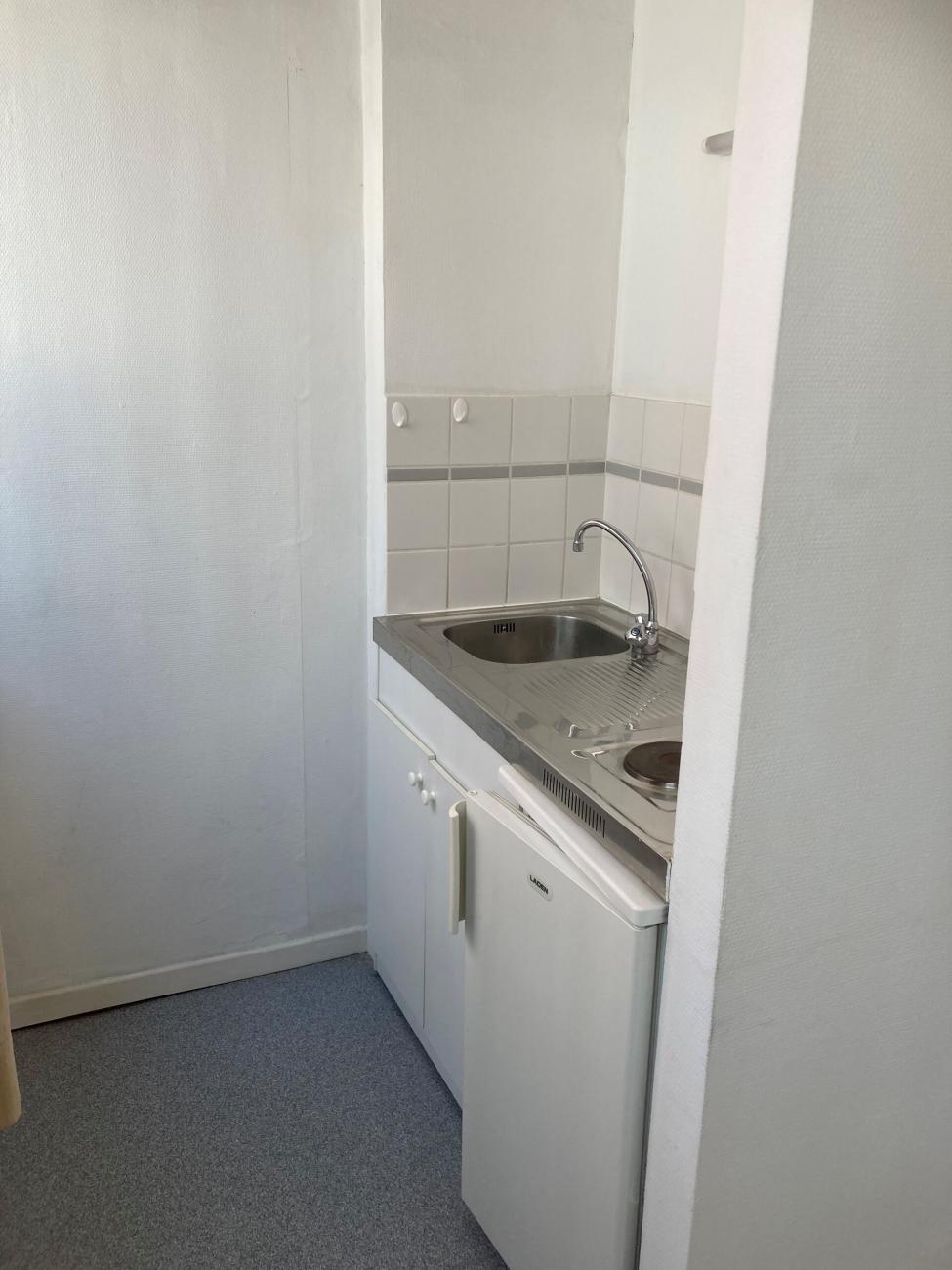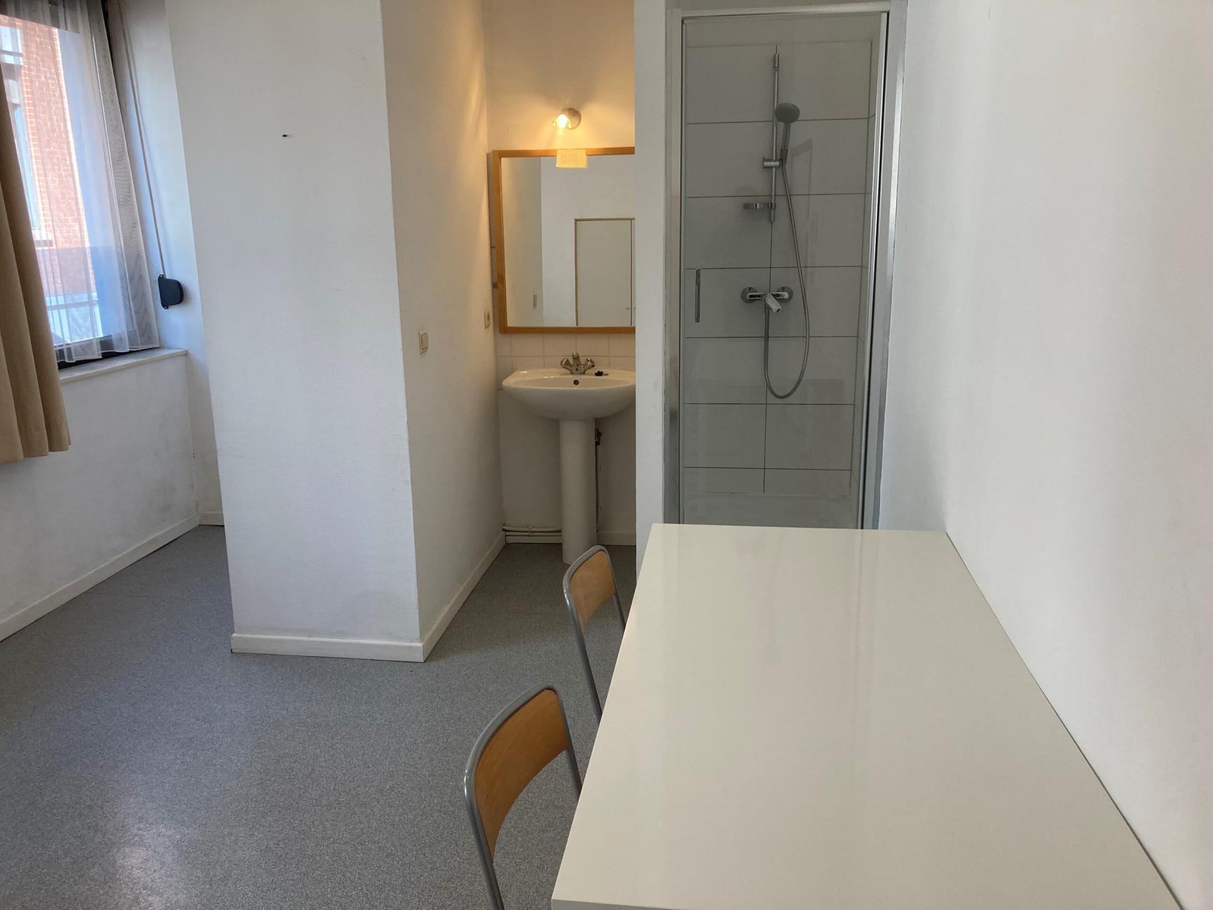 Le studio dispose d’une douche avec lavabo, d’un coin cuisine avec 2 plaques électriques, une armoire sous évier et un frigo, d’une garde-robes, d’une table de bureau, de deux chaises et d’un lit avec sommier (matelas à prévoir par le locataire).