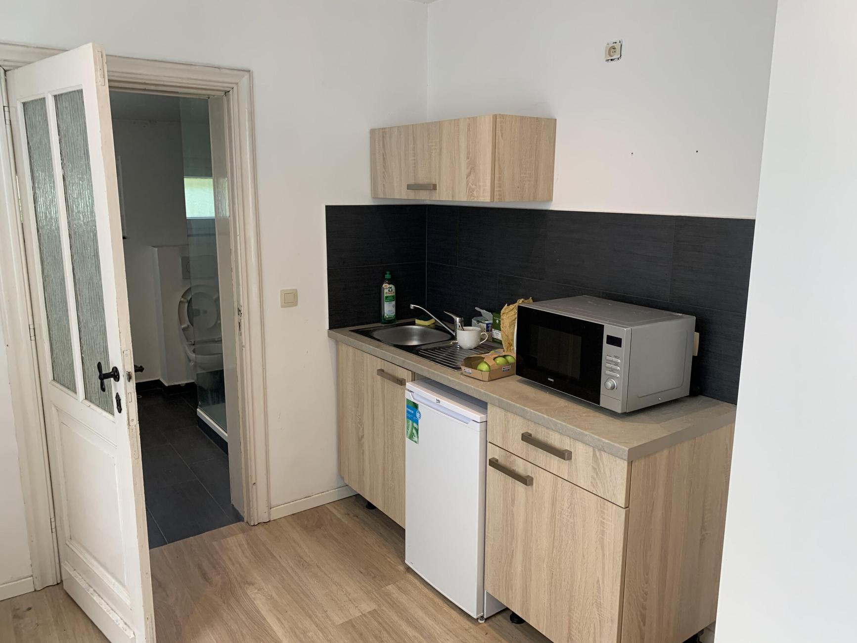 • Les studios possèdent : Une sdd privative (douche carrelée avec paroi vitrée, wc suspendu, lavabo avec meuble et miroir) et une kitchenette (frigo, micro-onde, évier et meubles de rangement)
