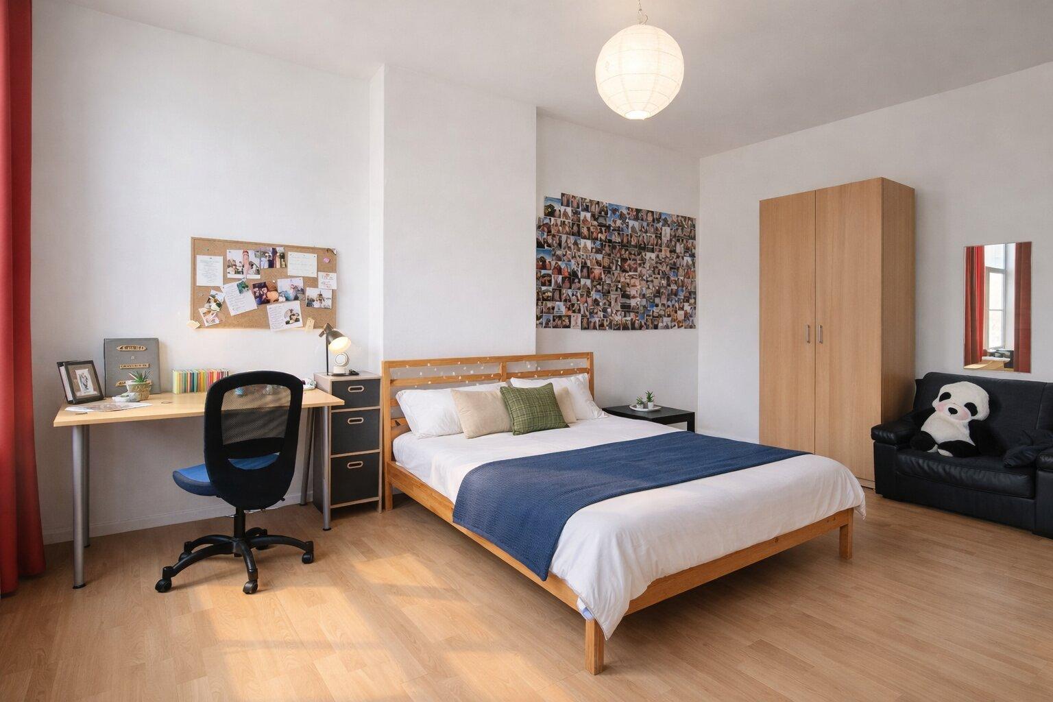 🪑 Fully furnished: bed with slatted base (possibility to install a double bed), wardrobe, desk with office chair, shelving, individual fridge, private sink