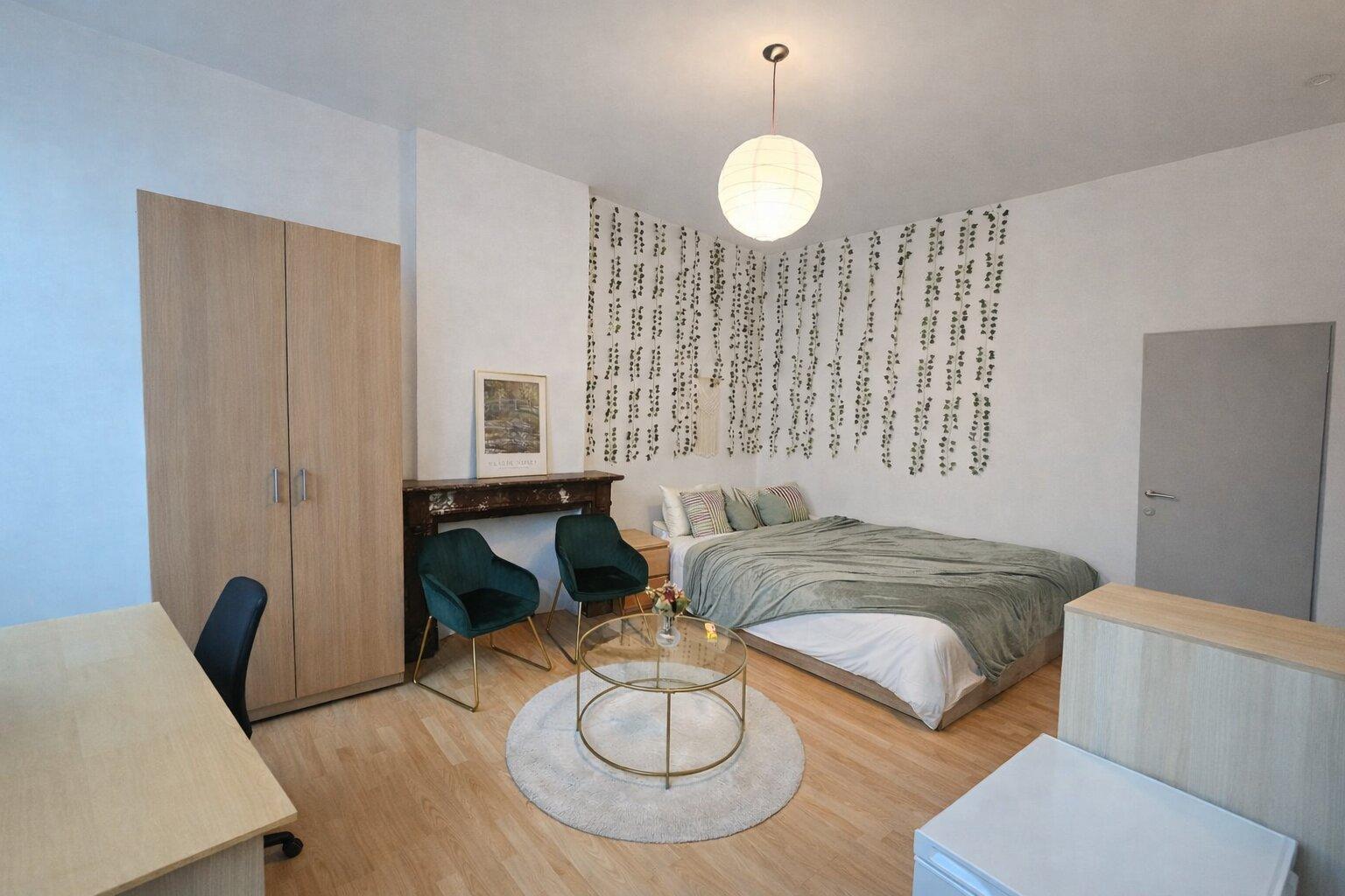 🪑 Volledig gemeubileerd: bed met lattenbodem (mogelijkheid tot tweepersoonsbed), kleerkast, bureau met bureaustoel, rek, individuele koelkast, eigen lavabo