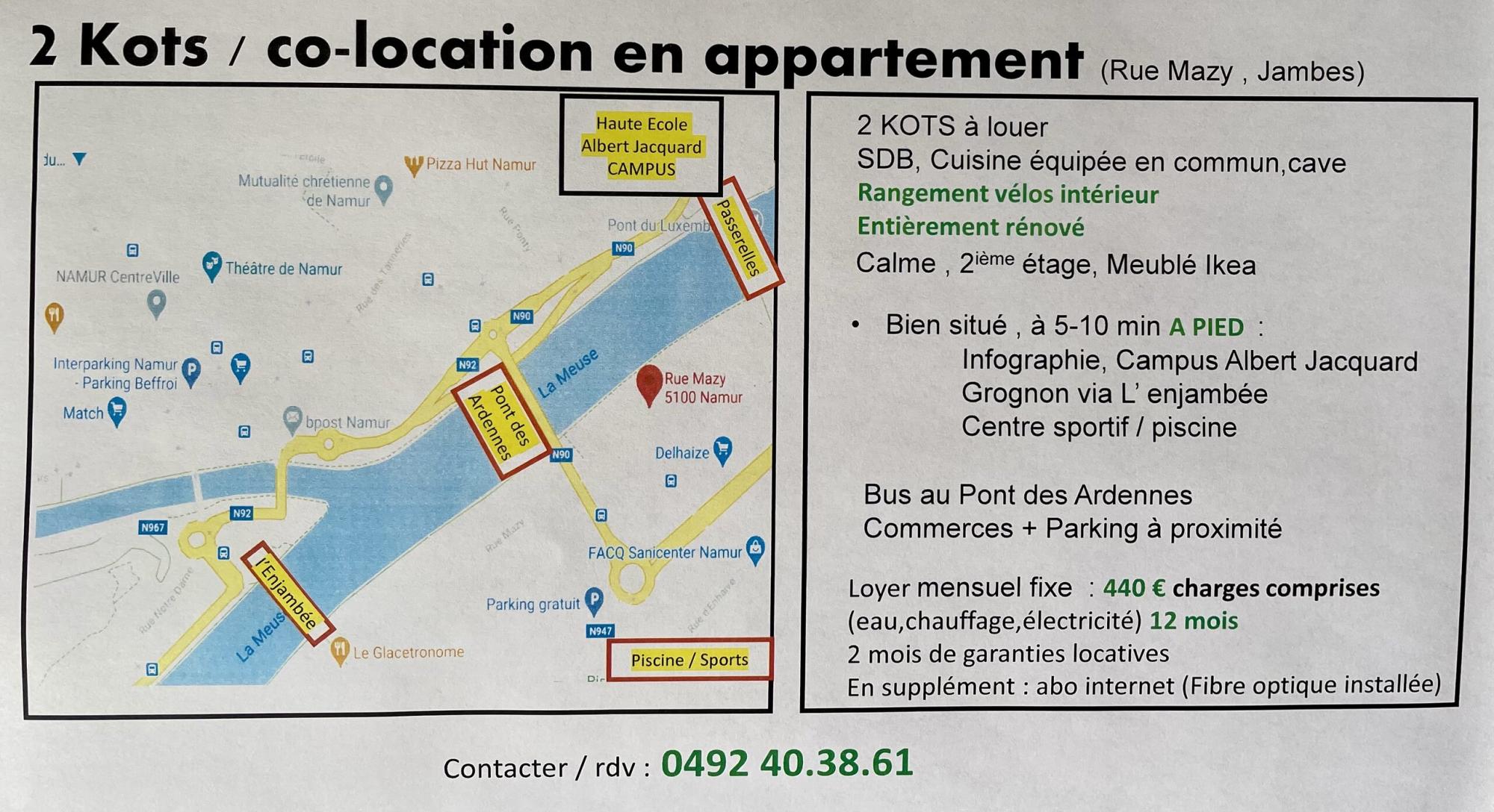 Dans un appartement au 2ième étage pour 3 étudiantes, le kot à l’arrière (côté jardin) et le kot à l’avant (côté rue) sont à louer.