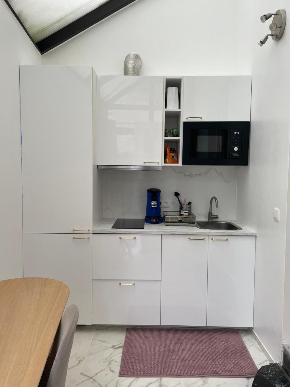 ✅ La cuisine est équipée : évier, grand frigo + congélateur encastré, 1 micro-onde encastré, taques, 1 four encastré, des armoires et des espaces de rangements, table de cuisine avec chaises.